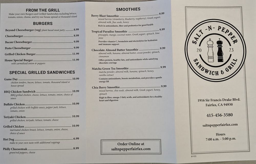 Introducing Salt-N-Pepper Sandwich & Grill, a culinary gem located at 1916 Sir Francis Drake Blvd, Fairfax, CA. This establishment specializes in classic bagels, hearty sandwiches, and indulgent burgers, offering a menu that caters to every craving. Signature items include the savory Turkey & Cranberry Sandwich and the mouthwatering Bacon Cheeseburger, both expertly prepared for a fulfilling experience.
